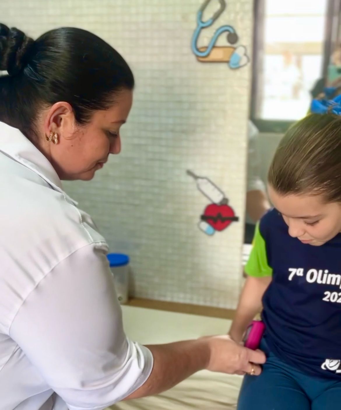 A enfermaria do colégio é um espaço dedicado ao cuidado da saúde dos alunos. A técnica de enfermagem, realiza triagens para avaliar as necessidades de cada um, garantindo atendimento rápido e adequado. Ela também administra medicações contínuas e fornece suporte especial para alunos com diabetes tipo 1, aplicando insulina quando necessário. O objetivo é garantir que todos se sintam seguros e bem cuidados durante o dia escolar.